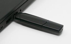 A USB memory that can be physically locked to a USB port, prevents USB memory theft.